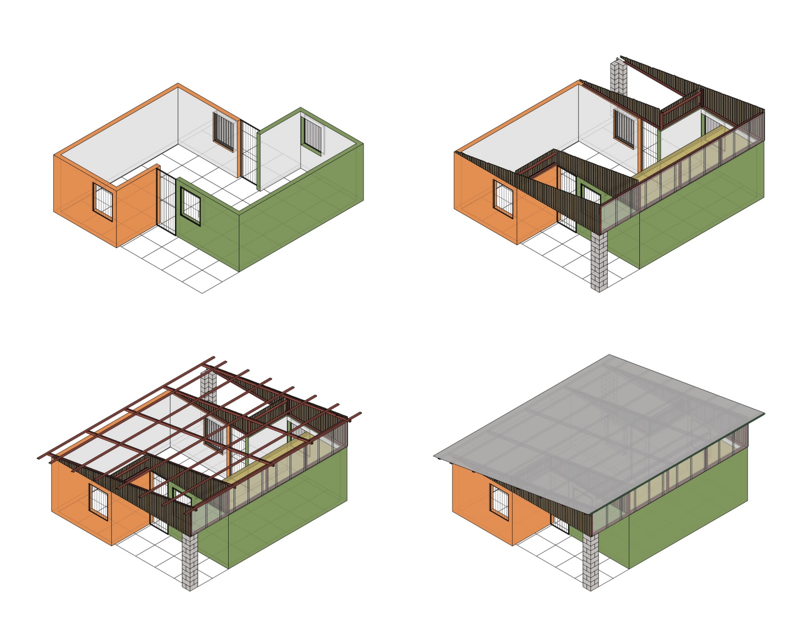 In their first housing community, Casas de la Esparanza built 6m x 6m cement block houses with zinc roofs. We sought to maximize the potential for the houses to expand over time. To do that we broke the spaces of the houses and shifted them slightly to allow for the growth of two more rooms at either end. We then created a roof that is angled to one side, allowing for more light and air to penetrate the houses and for water to be collected in vegetated areas. Casas de la Esperanza has built 10 of these new designs and is starting the process to build another 60-70.