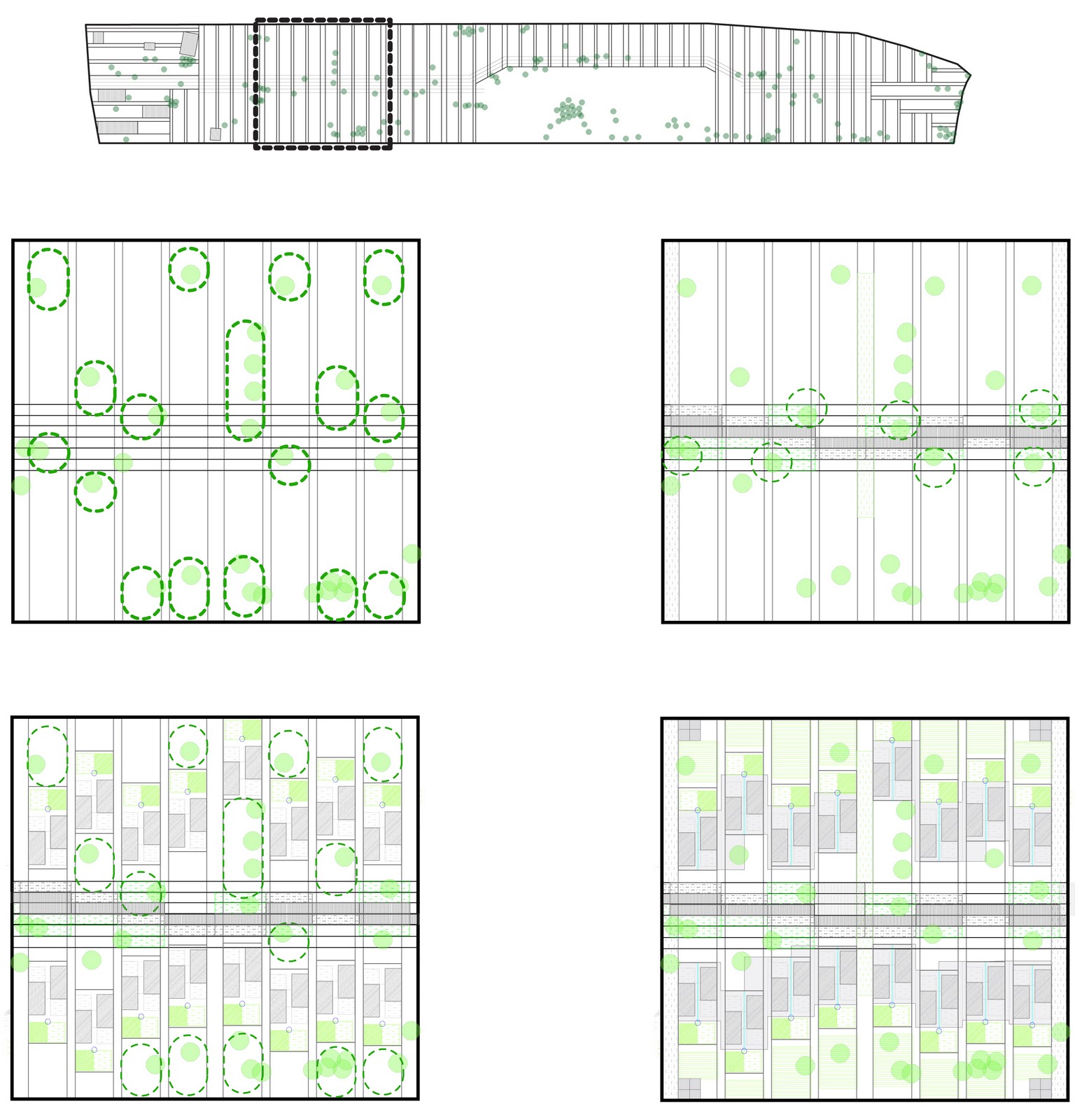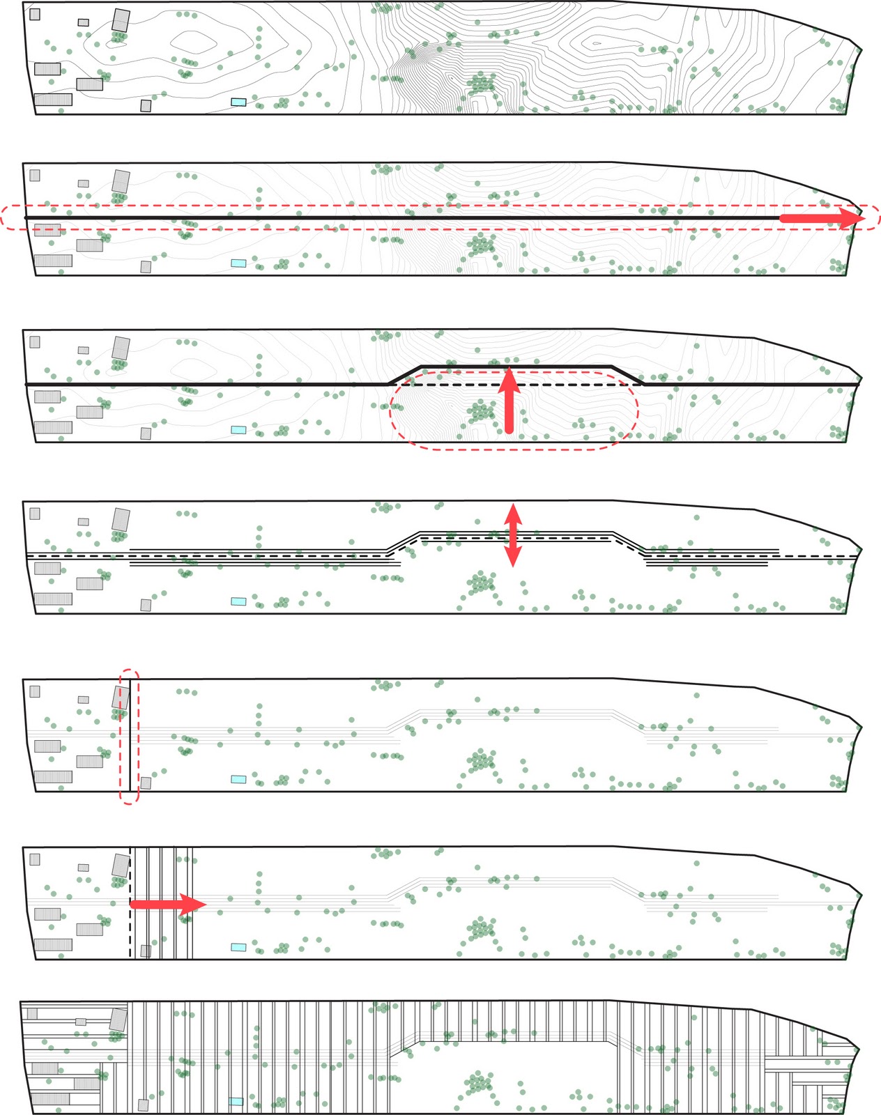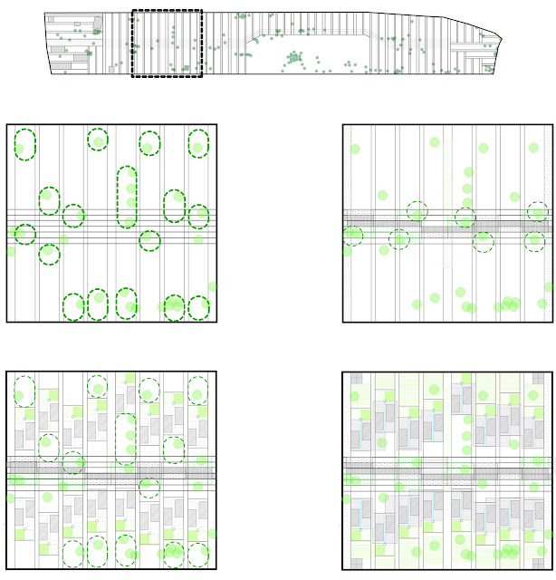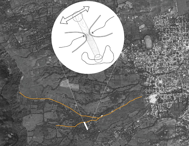 A FLEXIBLE MASTERPLAN The design of the masterplan was complicated by one major issue: a lack of reliable information about the site. It was known that topographic conditions and the location of trees were key to the design, yet such information was difficult to obtain. This was seen as an opportunity to challenge the hard-lined masterplan that sometimes dictates even the most minute details of a community. The masterplan starts out with one goal in mind: to save as many trees as possible while creating safe and flexible housing clusters. To reach this goal a set of simple directions are given to create a flexible urban armature, within which each house can be sited according to conditions on the ground. These instructions are simple and can be applied by anyone building the houses (local inhabitants, volunteers, or a professional construction crew) without much training.