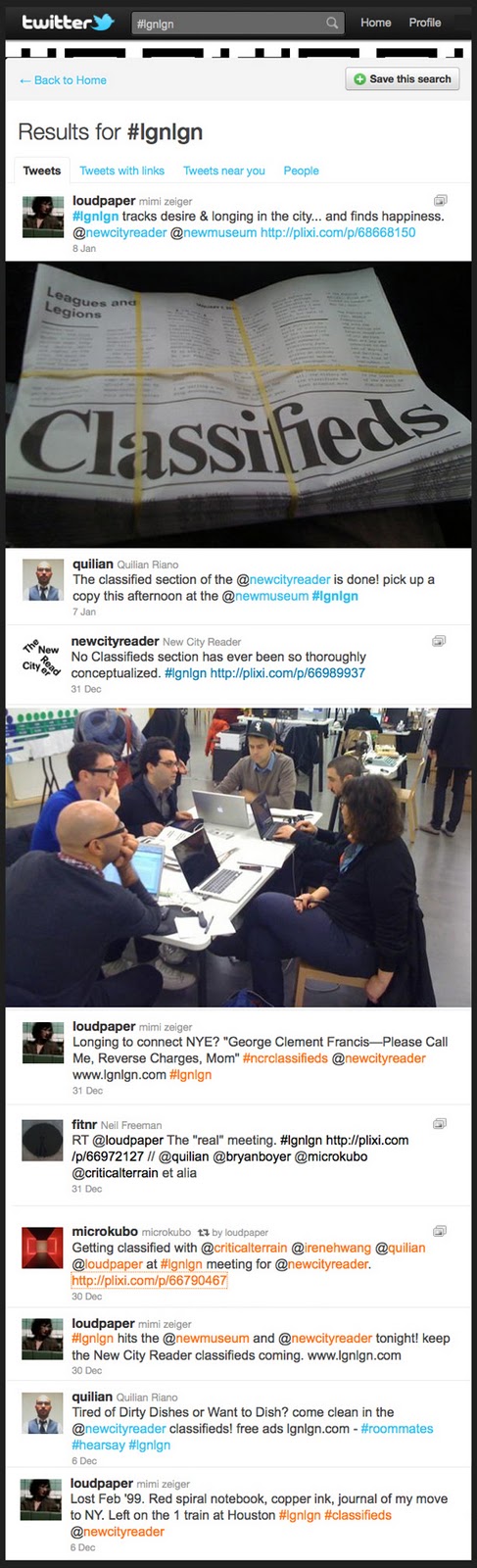 “The Leagues and Legions’ New City Reader Classified section maps longing, desire, guilt and regret in the city, as well as the city’s perceived losses and expressed desires through advertisements. The classifieds, while historically and economically tied to print, predate and postdate newspapers. In fact, the slow wasting of daily papers and alternative weeklies tracks the hemorrhaging of classified ads from ink to online. Still, they offer a charged platform for exchange: where personal concerns meet the commerce stream. The most intimate of commodities and announcements are made public. Yet the homogenized format of print classifieds and the resolute non-design of Craigslist provides a balm to modern afflictions, whether loneliness (personal ads), pain (runaways) or seaminess (rooms for let). By collecting ads –the wants and needs, lost and founds, missed connections and notices of New York City, Boston, Chicago and farther afield–we hope to momentarily capture urban desires. within this fleeting medium.”